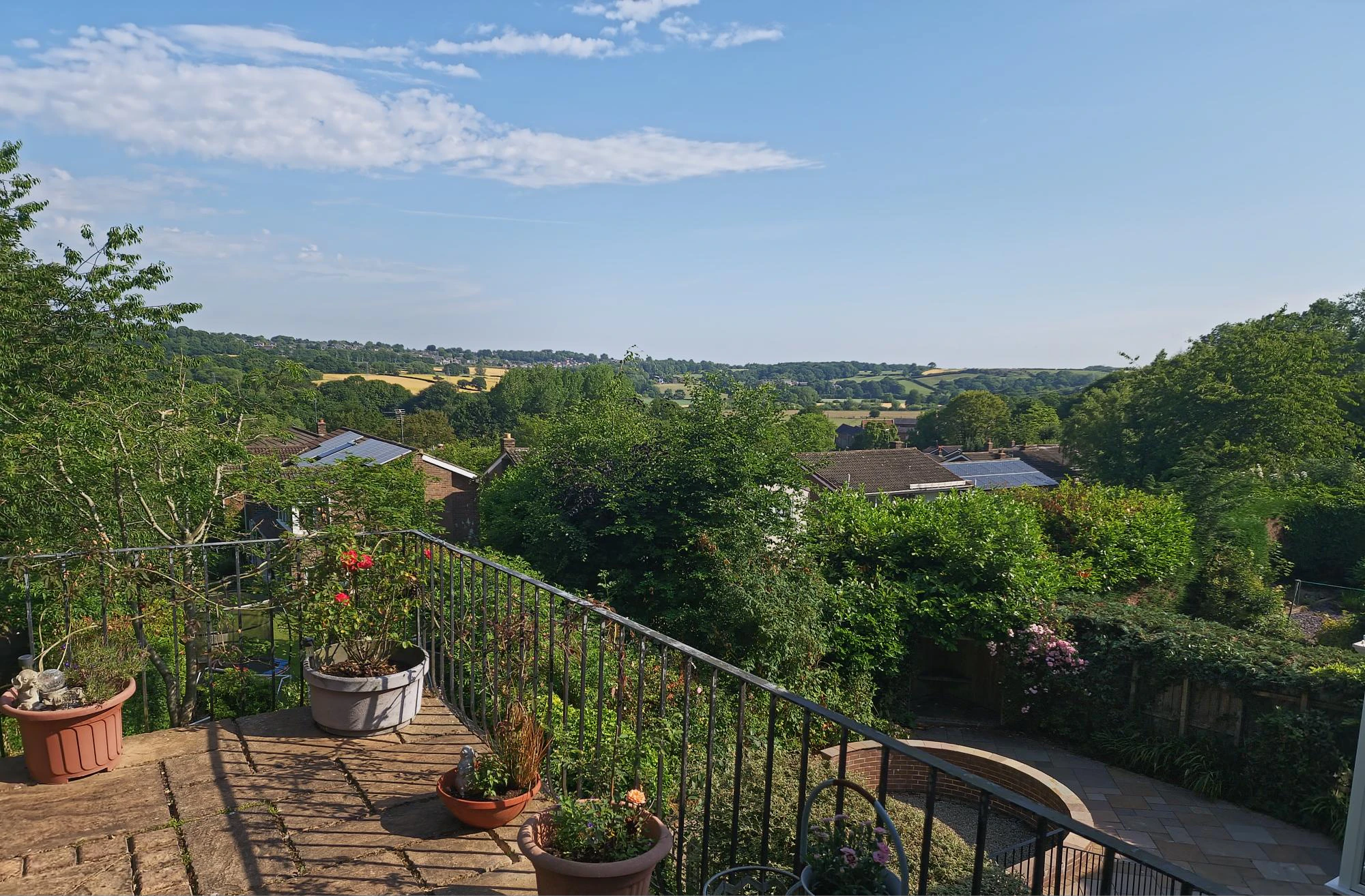 The welcoming hallway leads to a spacious main living room with a fireplace and garden views, while a second reception room offers built-in storage and direct garden access. A third reception room serves as a dining room. The principal living space also opens onto a terrace, enjoying a woodland backdrop and far-reaching views.