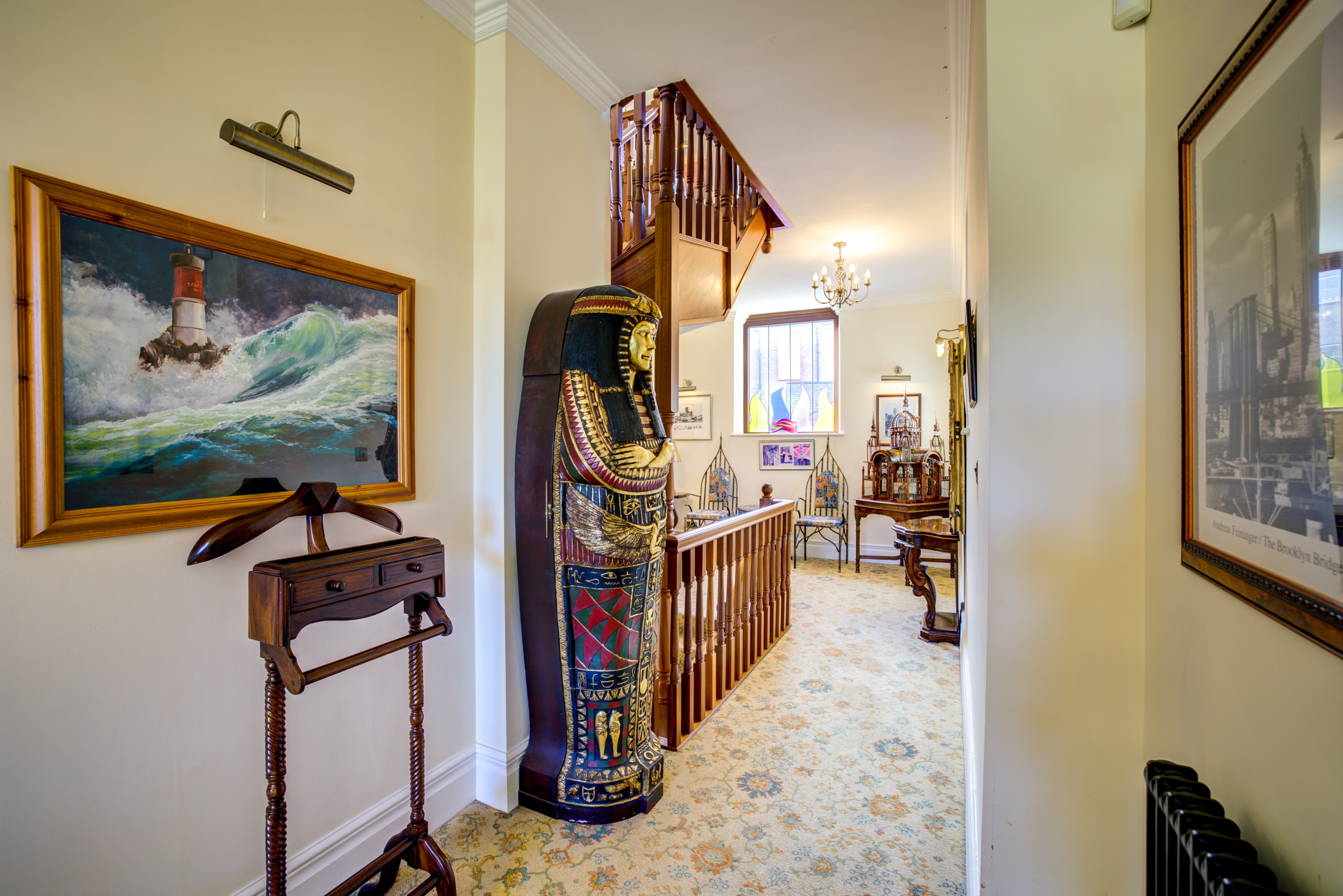 The first floor boasts a spacious half-landing that grants access to the galleried light well and opens onto a magnificent balcony with elevated river views. The master suite enjoys direct access to this deck, offering a private retreat with a dressing room and ensuite bathroom.
