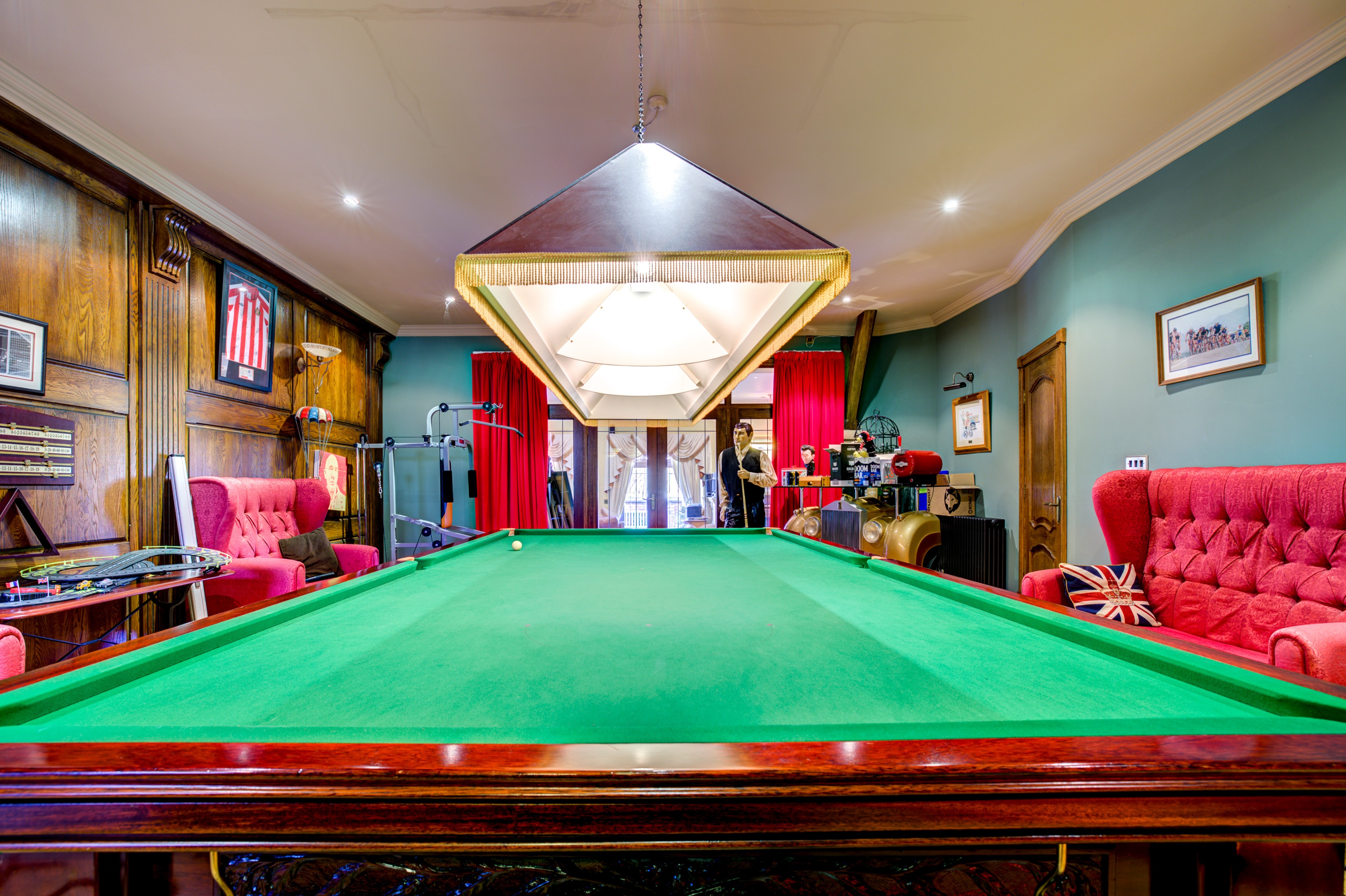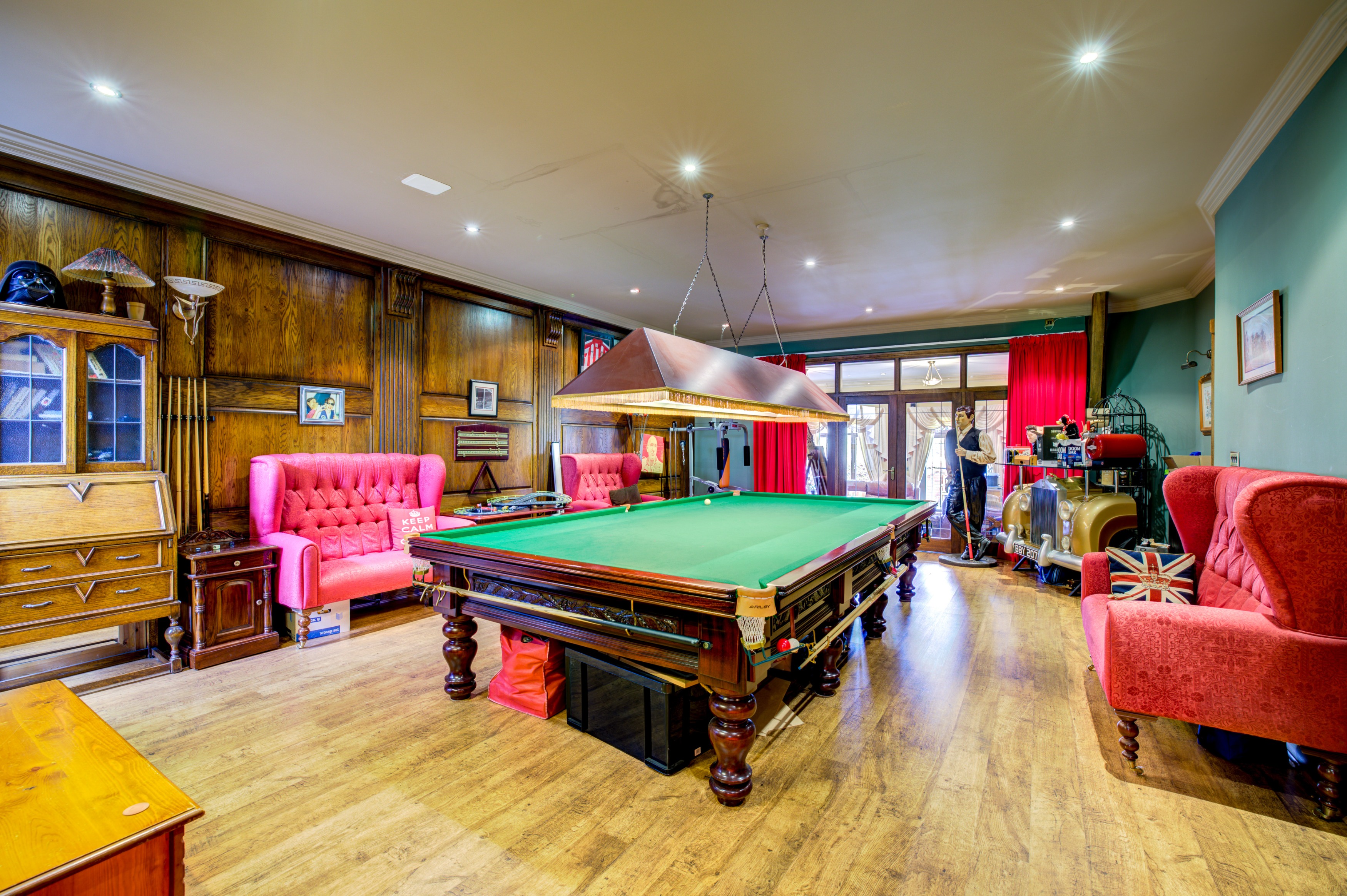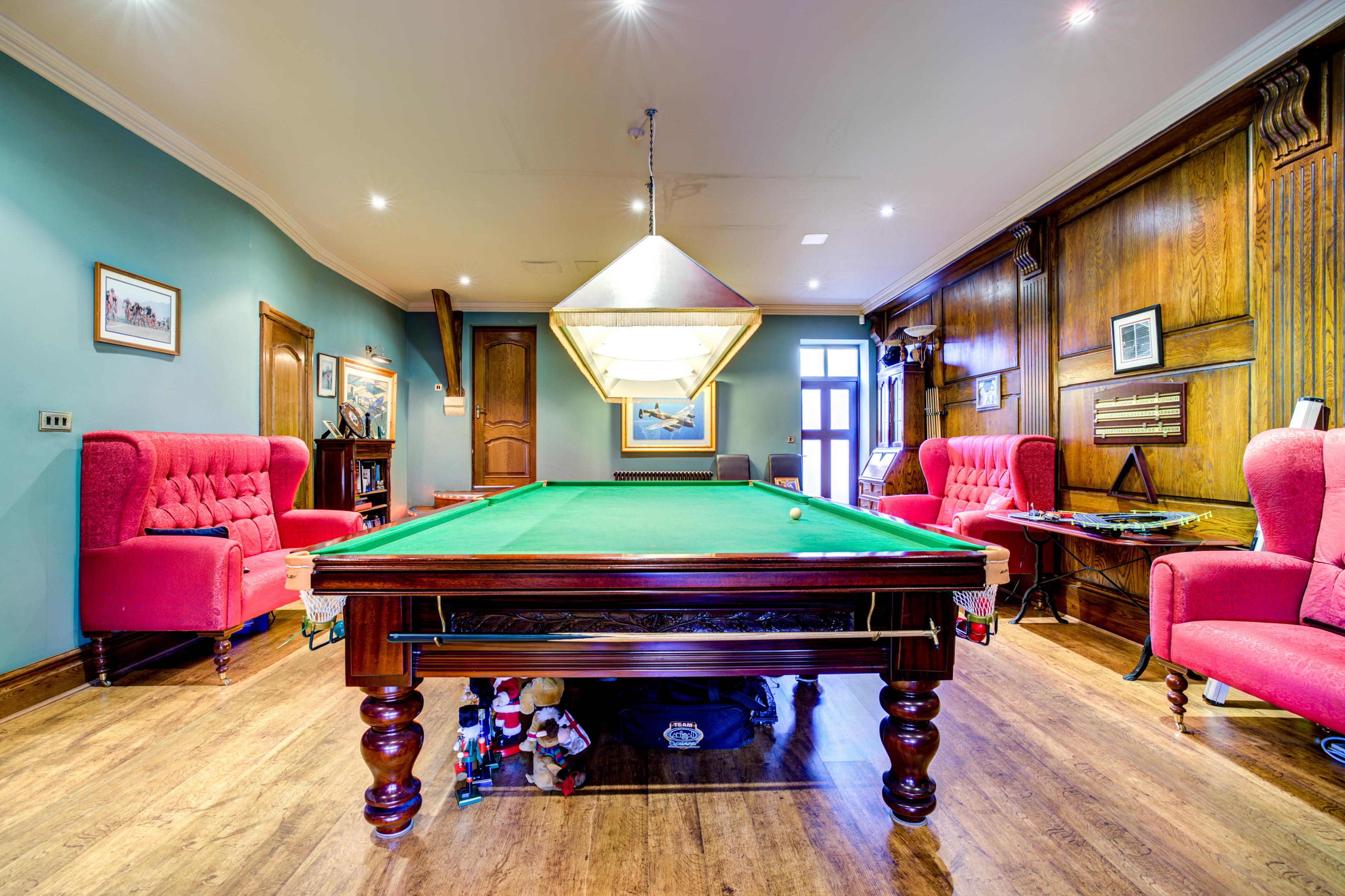 An illuminated staircase leads down to the full-sized snooker room, complete with oak-panelled walls and a ready-to-play table. Thoughtful design elements abound, including a galleried light well, carefully placed niches, custom oak doors, and Italian-imported radiators, blending historic elegance with modern comfort.