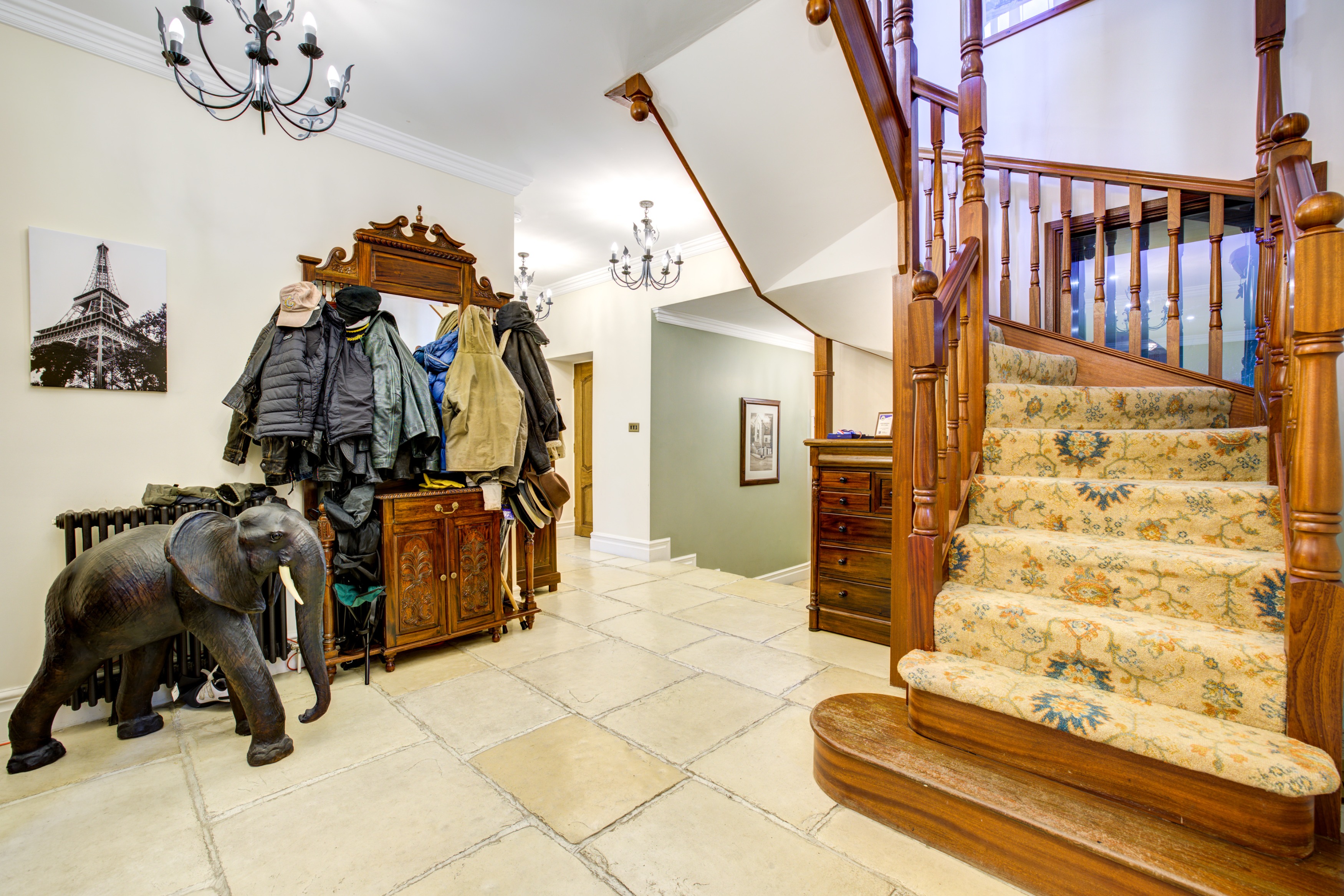 Stepping inside through the distinguished crucifix door, you are greeted by a polished stone floor and an open, airy hallway highlighted by a beautifully crafted hardwood staircase. This level also features two separate toilets, a cloakroom, and a utility room.